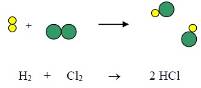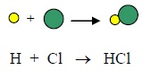 A.18. Proponed una explicación, a partir de la hipótesis atómico/ molecular de la estructura de las sustancias, sobre cómo puede ocurrir una reacción química, es decir, cómo pueden desaparecer unas sustancias y formarse otras que no estaban inicialmente. Concretad para el caso en que las sustancias simples hidrógeno y cloro (en fase gaseosa) reaccionan químicamente, desapareciendo (en parte) y aparece una sustancia nueva (que es un compuesto).Además de explicar las propiedades comunes de todos los materiales, el comportamiento físico de los gases y la diversidad de sustancias, el modelo atómico-molecular permite una fácil interpretación de las reacciones químicas, pues pueden considerarse como un proceso en el que las moléculas de las sustancias iniciales (reactivos) desaparecen debido a su ruptura (si tienen varios átomos) y en el que se forman nuevas moléculas (lo que implica nuevas sustancias) mediante la unión de los mismos átomos pero de forma distinta. Así, si el hidrógeno y el cloro fueran monoatómicos, su reacción podría explicarse mediante el siguiente esquema: |