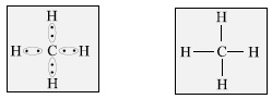 De acuerdo con la fórmula del metano se darán cuatro enlaces covalentes simples entre el carbono y el hidrógeno. Podemos representar la molécula como: