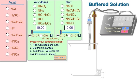 Consecuencias:1.- Puede comprobarse que si preparamos una disolución amortiguadora que tenga las mismas concentraciones del ácido (o la base) y la sal, se cumplirá que:pH = pKaEsto nos permite seleccionar el sistema amortiguador adecuado dependiendo del rango de pH que queramos mantener constante. Por ejemplo, si queremos mantener el pH entre 4,5 y 5,0, una buena elección sería el sistema acético/acetato porque el pKa del ácido acético es 4,74. Sin embargo, si queremos mantener el pH entre 9,0 y 10,0; una buena elección sería el sistema amoniaco/cloruro de amonio porque el pKa del ion amonio es 9,26.Si queremos que el pH de la disolución amortiguadora sea una unidad mayor que el pKa, la concentración de la sal tendrá que ser 10 veces mayor que la del ácido (o base). Si queremos que el pH sea una unidad menor que el pKa, la concentración del ácido (o base) tendrá que ser 10 veces mayor que la de la sal.2.- El pH de la disolución amortiguadora depende la proporción entre las concentraciones de ácido (o base) y sal, no de sus concentraciones absolutas.3.- Cuando se añaden ácidos o bases fuertes, cambian las concentraciones de ácido (o base) y de sal en la disolución amortiguadora. Esto provoca que también cambie el cociente entre ellas. Sin embargo, el pH depende del logaritmo del cociente de concentraciones y no cambiará significativamente hasta que uno de los factores se aproxime a cero. |