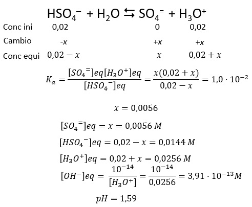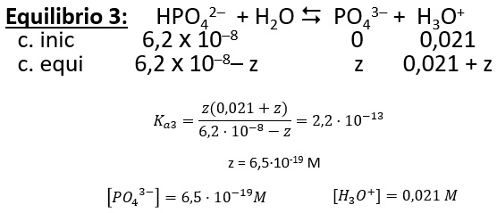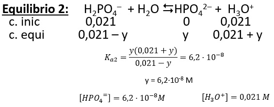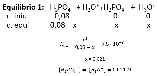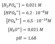 En el caso de los ácidos polipróticos, el pH se calculará después de determinar la concentración total de iones hidronio, es decir, la suma de las concentraciones de iones hidronio que producen cada uno de los procesos de desprotonación. En la práctica tratamos los equilibrios de ionización de forma secuencial. Los resultados del primer equilibrio sirven como datos de partida para el segundo, y los resultados del segundo equilibrio sirven como datos de partida para el tercero. Hay que tener en cuenta que a medida que un ácido poliprótico pierde protones, se convierte en otros ácidos más débiles. Por ejemplo, el ácido sulfúrico es un ácido fuerte en la primera desprotonación, el primer protón se pierde por completo, formándose el ion hidrógeno sulfato. Sin embargo, este ion no es un ácido fuerte en la segunda desprotonación, el segundo protón no se pierde por completo, estableciéndose un equilibrio y quedando en el medio acuoso una cierta cantidad de ion hidrógeno sulfato sin ionizar.Determinar las concentraciones de todas las especies presentes y el pH de una disolución 0,02 M de ácido sulfúricoEn el primer equilibrio el ácido sulfúrico es un ácido fuerte que se ioniza por completo. Por tanto, la determinación de la concentración de iones hidronio que se producen es inmediataEn el segundo equilibrio el ion hidrógeno sulfato no se comporta como un ácido fuerte y sólo se ioniza parcialmente. Su constante de acidez es Ka=0,01. En esta segunda ionización hay que tener en cuenta las concentraciones iniciales de ion hidrógeno sulfato y de ion hidronio.El pH resultante no es 1,40 que fue el que obtuvimos suponiendo que en ambas etapas la desprotonación era completa. Esta diferencia (0,19 unidades de pH) se debe a que el ion hidrógeno sulfato no es un ácido fuerte disociado completamente.Determinar las concentraciones de todas las especies en el equilibrio y el pH de una disolución 0,08 M de ácido fosfórico (H3PO4). Las sucesivas constantes de acidez son: Ka1=7,5·10-3 ; Ka2=6,2·10-8 y Ka3=2,2·10-13Los sucesivos equilibrios se tratatarán secuencialmente[H3PO4] = 0,059 MEstos datos sirven de partida para el segundo equilibrioy estos datos sirven de partida para el tercer equilibrioEn definitiva, los resultados son los siguientes:Del ácido fosfórico original queda [H3PO4] = 0,059 M sin ionizar, y de los iones formados:Realmente solo el primer equilibrio aporta una cantidad significativa de protones al medio. Los iones dihidrógenofosfato e hidrógenofosfato son muy débiles en comparación con el ácido fosfórico. |