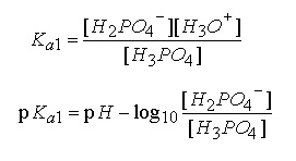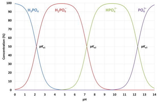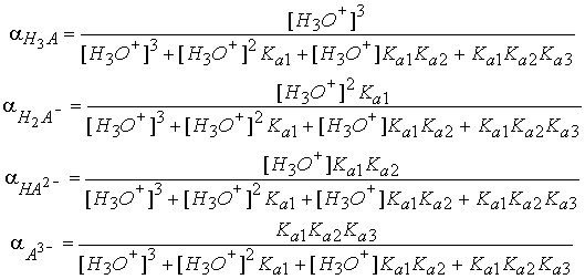 La concentración de las formas molecular e iónicas de un ácido poliprótico cambian con el pH de la disolución. A pH bajos abundan las formas con mayores contenido de hidrógeno y a pH altos abundan las formas con menores contenido de hidrógeno.Para el ácido fosfórico: pKa1= 2,15 ; pKa2 = 7,2 y pKa3 = 12,15Por tanto, el punto con pH=pKa1está justo en la mitad del primer punto de equivalencia. Lo mismo podría decirse de pKa2 con respecto al segundo punto de equivalencia y de pKa3 para el tercero.En general, las fracciones relativas de las distintas formas de un ácido poliprótico se pueden obtener a partir de las siguientes ecuaciones, obtenidas de un balance de materia y de las constantes de equilibrio: |