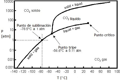 DIAGRAMAS DE FASESUn diagrama de fases muestra los estados de agregación de una sustancia en diferentes condiciones de presión y temperatura.Líneas en el diagramaEntre cada dos fases de una sustancia hay una línea que representa cómo varía la temperatura de cambio de estado con la presión. Una línea separa las regiones de sólido y líquido (temperatura de fusión), otra las de líquido y gas (temperatura de ebullición) y otra las de sólido y gas (temperatura de sublimación).Puntos en el diagramaEn el punto triple coexisten las tres fases. En el punto crítico deja de existir diferencias entre las fases líquida y gasesosa.