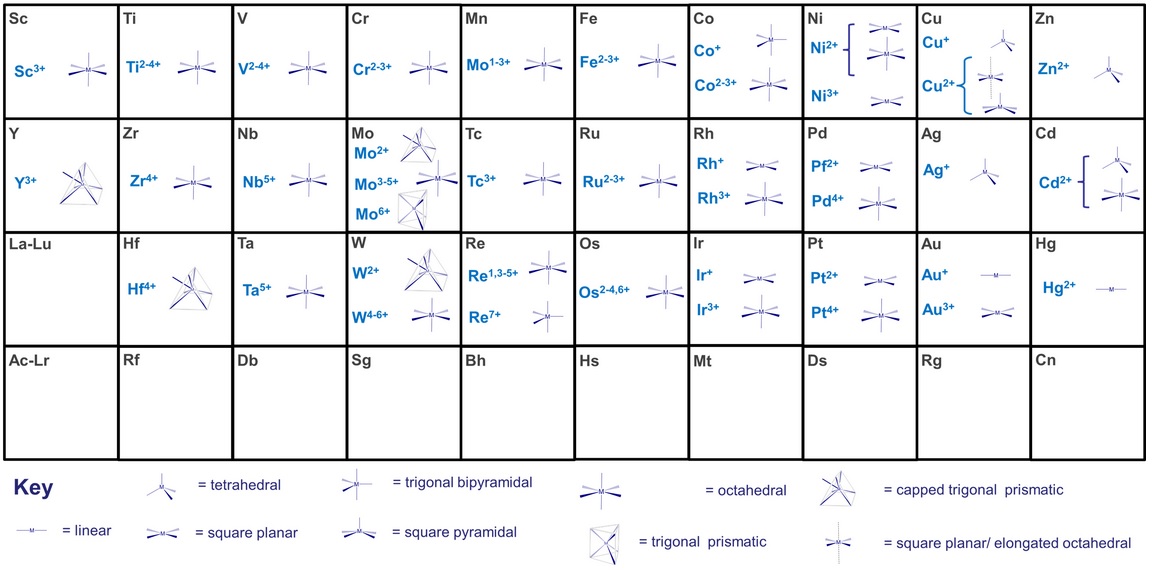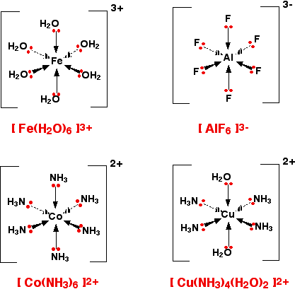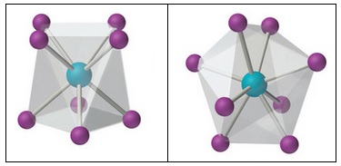 Como en todas las estructuras químicas, los complejos de coordinación adquieren la forma que mejor estabiliza el conjunto formado por el ion central y los ligandos. El número de ligandos que rodean al ión metálico central depende de:- El tamaño del ion metálico central. Los pequeños metales de transición pueden alojar seis ligandos, sin embargo, los voluminosos lantánidos o actínidos, pueden llegar a doce o más.- El tamaño de los ligandos. Los ligandos pequeños permiten mayores números de coordinación.Aunque se conocen índices de coordinación en el rango 2 - 16, los más comunes son 4 y 6.IONES COMPLEJOS TETRACOORDINADOSEn complejos metálicos tetracoordinados las estructuras más comunes son: tetraédrica y plana cuadrada.Es el caso de los iones [CuCl4]2- y [CoCl4]2-. En ellos el índice de coordinación es 4 en lugar de 6 por el gran tamaño de los iones cloruro que hace que no quepan más en torno al ion metálico central.En el caso del cisplatino Pt(NH3)Cl2 la estructura es plana cuadrada (el platino, los dos cloro y los dos amoniaco están en el mismo plano). Este es complejo metálico que inhibe la síntesis de ARN, ADN y proteínas en las células y es utilizado como medicamento contra el cáncer.IONES COMPLEJOS HEXACOORDINADOSEs el caso más común. En él el ion central forma seis enlaces con los ligandos que lo rodean. Las estructuras hexacoordinadas más comunes son: octaédrica y triangular prismáticaEn los siguientes iones la estructura es octaédrica, cuatro de los ligando están en el mismo plano que el ion metálico, uno por encima y otro por debajo.La coordinación prismática triangular es mucho menos frecuente. Algunos ejemplos son los siguientes:OTROS ÍNDICES DE COORDINACIÓNEn los índices de coordinación mayores de 6 el número de posibles estructuras aumenta mucho, además las diferencias energéticas entre ellas son más pequeñas.Índice de coordinación 2Se presenta en iones metálicos que tienen el nivel d completo (d10), por ejemplo: Cu+; Ag+; Au+; Hg2+. Su estructura es lineal.Es el caso del ion diaminplata(I).Índice de coordinación 3Su estructura es triangular planaAl igual que el índice de coordinación 2, se presenta en iones en los que el metal tiene completo el nivel d. Es el caso del ion HgI3-. Otros ejemplos son: [Cu(SPMe3)3]+, [Ag(PPh3)3]+, [Au(PPhCy2)3]+ y [Pt(PPh3)3]Índice de coordinación 5El índice de coordinación 5 no es común y se puede presentar en dos estructuras: bipirámide triangular y pirámide cuadradaEntre los complejos con coordinación 5 se encuentran [Fe(CO)5] y [CuCl5]3-.pentacarbonilo de hierro En general los complejos del Re7+ presentan esta coordinación.Índice de coordinación 7Es raro y se presenta en el caso de iones voluminosos como los de metales de transición pesados, lantánidos y actínidos. La estructura más común es la bipirámide pentagonal.Algunos ejemplos son: [Mo(CN)7]3-, [W(CN)7]3-, y [Os(CN)7]3-Índice de coordinación 8Las estructuras más comunes con este índice de son: antiprisma cuadrado y dodecaedro.Un ejemplo es [Mo(CN)8]3-Índice de coordinación 9La estructura más común con este índice de coordinación es el antiprisma trigonal triapicado.Ejemplos son: [ReH9]2- , [Sc(H2O)9]3+, [Y(H2O)9]3+ , y [La(H2O)9]3+Índices de coordinación 12 a 16Índices superiores a 9 son muy raros. Ejemplos son:Coordinación 12: [Ce(NO3)6]2-Coordinación 16: [CoB16]−RESUMEN |