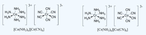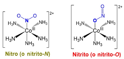 ISÓMEROS ESTRUCTURALESIsómeros que contienen el mismo número de átomos de cada clase pero unidos en un orden diferente. En los complejos de coordinación este tipo de isomería se manifiesta en el hecho de que los ligandos están unidos de manera fiferente al ion metálico central. Hay tres tipos de estos isómeros: IONIZACIÓN, COORDINACIÓN Y ENLACE.ISÓMEROS DE IONIZACIÓNEn los isómeros de ionización hay al menos dos iones que pueden actuar como ligandos. Entre ellos difieren en cual de ellos actúa como ligando o como contraion. |
