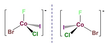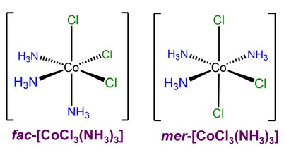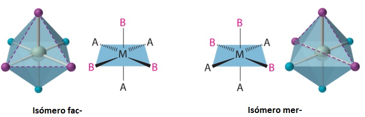 Los complejos octaédricos con tres ligandos iguales solo pueden existir en un ordenamiento fac- (de facial) o mer- (de meriodinal). En el isómero fac- los tres ligandos iguales ocupan caras triangulares opuestas del octaedro. En el isómero mer- los tres ligandos de cada clase ocupan lo que podría denominarse meridiano del octaedro.