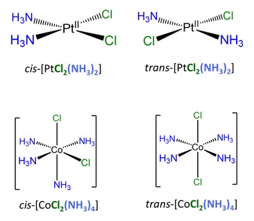 ESTEREOISOMERÍA(DIASTEREÓMEROS)En este apartado distinguiremos dos tipos de diastereómeros, los que se producen por isomería geométrica y los que surgen de la isomería conformacional (λ y δ).ISOMERÍA GEOMÉTRICAEn el caso de los complejos metálicos hay que distinguir dos tipos de isomería geométrica: la isomería cis-trans y la isomería fac-mer.En los complejos metálicos con geometría plana cuadrada u octaédrica se produce la isomería cis-trans. Isómeros geométricos cis-trans son complejos metálicos en los que dos ligandos son adyacentes unos a otros (cis) o son opuestos unos a otros (trans) en la esfera de coordinación del metal. Tanto