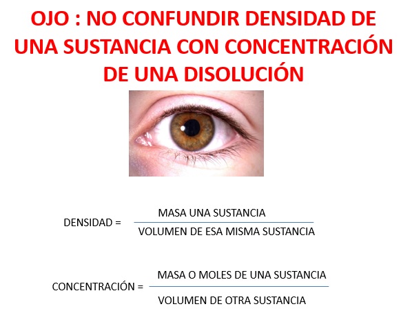 Cuando se expresa una concentración en porcentaje masa/volumen, su unidad es la misma que la de densidad (por ejemplo g/cm3). Aunque eso ocurra, no deben confundirse. La densidad mide la relación existente entre la masa y el volumen de una misma sustancia (pura o mezcla). Por ejemplo, podemos hablar de la densidad del mercurio (13,6 g/cm3) o del agua de mar (1,02 g/cm3). En ambos casos la masa del numerador y el volumen del denominador se refieren a la misma sustancia (mercurio o agua marina). En el caso de la concentración, aunque las unidades sean las mismas, están referidas a sustancias diferentes. Por ejemplo, la concentración del agua marina es 35 g NaCl/1000 cm3 de agua marina. En el numerador tenemos la masa de soluto (cloruro de sodio) y en el denominador el volumen de la disolución (agua marina). |
