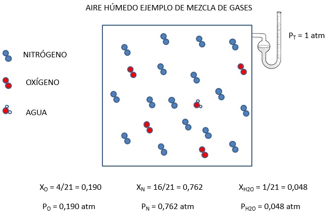 Si consideramos el aire (seco) como una mezcla de nitrógeno y oxígeno en proporción volumétrica del 80:20 %, el aire húmedo es simplemente esa misma mezcla con un cierto contenido de agua (vapor). El aire húmedo se podría considerar una disolución de un gas (agua) en otro gas (aire).