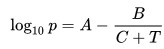 La presión de vapor de una sustancia pura puede ser estimada mediante la ecuación de Antoine, donde P es la presión de vapor, T es la temperatura y A, B y C son constantes características.