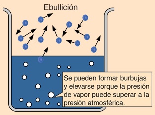 Es importante resaltar que cuando se alcanza la temperatura de ebullición del agua, la presión parcial de vapor del agua es 101,3 kPa, es decir, la presión atmosférica normal. De hecho, se define la temperatura de ebullición de un líquido como la temperatura a la que su vapor en equilibrio tiene una presión igual a la presión del entorno (normalmente la atmosférica). Por ejemplo, si subimos a una montaña y la presión atmosférica es 70,10 kPa, el agua hervirá a 90 ºC (ver tabla.