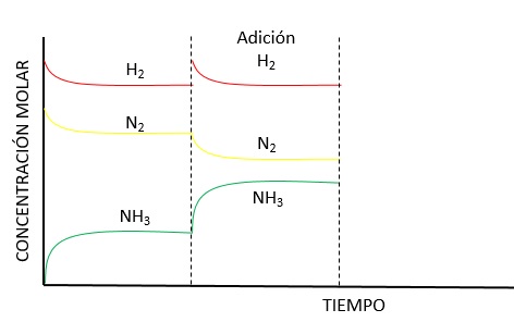 Modificación de las concentraciones de reactivos o productos1.- Adición de un reactivoSupongamos el equilibrio N2(g) + 3 H2(g) ⇔ 2 NH3(g)¿Cómo afectaría a la reacción en equilibrio la adición de más H2?Según el Principio de Le Chatelier el sistema reaccionará tendiendo a minimizar el incremento de H2. Por tanto, la reacción se debe desplazar hacia la derecha (hacia los productos) porque, de esa forma, parte del H2 añadido se consumirá a través de su reacción con el N2.