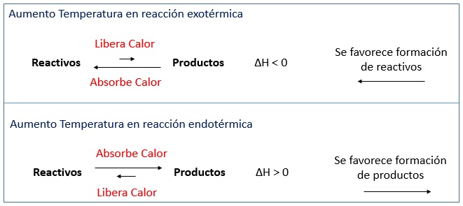 Modificación de la TemperaturaCuando decimos que una reacción es, por ejemplo, exotérmica queremos indicar que la reacción directa (la que ocurre de izquierda a derecha) libera energía. Lo que suele olvidarse es que la reacción inversa (la que ocurre de derecha a izquierda) es endotérmica, es decir, absorbe energía. |