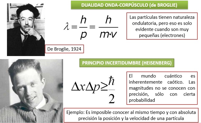 PRINCIPIOS DE LA FÍSICA CUÁNTICADurante el primer cuarto del siglo XX se descubrieron nuevos hechos que ponían de manifiesto que a nivel atómico ocurrían fenómenos que no se podían explicar con la Física Clásica. Como resultado de este ambiente creativo, surgieron nuevos principios que establecían los fundamentos de la nueva Física Cuántica. Entre ellos destacaremos la DUALIDAD ONDA-CORPÚSCULO de De Broglie y el PRINCIPIO DE INCERTIDUMBRE de Heisenberg.La dualidad onda-corpúsculo de Louis De Broglie viene a generalizar esa dualidad ya observada por Einstein en la luz (onda-fotones). Según De Broglie, a nivel atómico los entes que siempre se habían considerado como partículas también se comportaban como ondas. Todas las partículas en movimiento (por ejemplo los electrones) llevan asociada una onda cuya longitud de onda se calcula por el cociente λ =h/mv. Por su parte, el Principio de Incertidumbre de Heisenberg demuestra que a nivel atómico la medida de magnitudes solo se puede hacer con cierto nivel de certidumbre, solo podemos conocer la probabilidad de que algo ocurra. El nivel cuántico es esencialmente caótico.