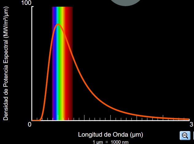 Los cuerpos negros no tienen por qué ser de color negro. Las bombillas incandescentes o el Sol son cuerpos negros porque su espectro es continuo. Sin embargo, una bombilla fluorescente no es un cuerpo negro ya que la luz que emite está concentrada en unas pocas longitudes de onda, no tiene un espectro continuo.En la práctica, un cuerpo negro puede ser construido en una cavidad (horno) que tenga un pequeño orificio (idea de Kirchhoff, 1859). Toda la radiación que entra por él es retenida en su interior mediante sucesivas absorciones y emisiones por parte de los átomos de la superficie interna. En el equilibrio, los átomos emiten la misma cantidad de energía que la que absorben procedente de otros átomos.La siguiente simulación de PHET le permitirá entender mejor las características de la radiación de un cuerpo negro. Úsela para comprobar los siguientes hechos:- El horno que utilizamos en la cocina está caliente pero no emite luz visible.- El hierro caliente no emite luz visible hasta que alcanza aproximadamente 1300 K. En ese momento la luz que emite es roja (Hierro al rojo)- Si el hierro (o cualquier otro objeto) se sigue calentando (por ejemplo hasta 2000 K) emite luz más intensa y el color cambia de rojo a blanco.- El filamento de una bombilla a 3000 K emite luz blanca.- El Sol a 5700 K emite luz blanca. También emite luz ultravioleta.