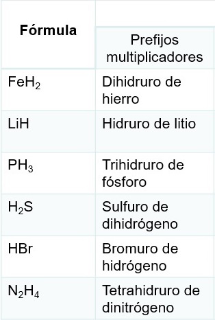 Para las combinaciones de hidrógeno con elementos de los grupos 1–15 (antiguos hidruros metálicos) se utiliza la denominación hidruro para el hidrógeno. Esto es consecuencia de que en estos casos el hidrógeno es la parte electronegativa del compuesto, por lo tanto, su nombre debe terminar en el prefijo -uro.Para indicar la proporción de los elementos en el hidruro se pueden usar los prefijos multiplicadores:multiplicador-hidruro de elementoCuH2dihidruro de cobre