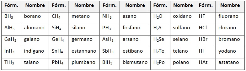 Hidruros progenitoresLos hidruros de los elementos de los grupos 13-17 del SP se toman como hidruros progenitores. El nombre de éstos se construye a partir del nombre del elemento con el sufijo -ano, excepto el metano. La utilidad de esta nomenclatura es que, a partir de ellos, por sustitución de los átomos de H, se forman los compuestos derivados.