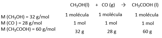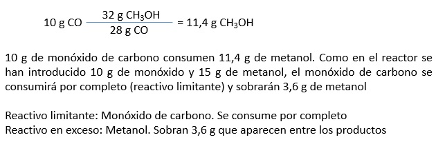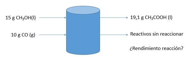 EJERCICIOLa reacción entre el alcohol metílico y el monóxido de carbono produce ácido acético. En una experiencia se usaron 15,0 g de metanol y 10,0 de monóxido de carbono, obteniéndose 19,1 g de ácido acético. Determinar: