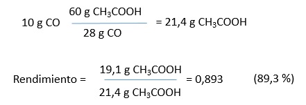 6.- ConclusiónSi se mezclan 10 g de monóxido de carbono y 15 g de metanol para producir ácido acético, el reactivo limitante es el monóxido de carbono, sobrando 3,6 g de metanol que aparecería mezclado con el ácido acético. En el caso de que esta reacción tuviera un rendimiento del 100 % se deberían obtener 21,4 g de ácido acético. Sin embargo, como solo se obtienen 19,1 g, la reacción no se completa y tiene un rendimiento del 89,3 %. |