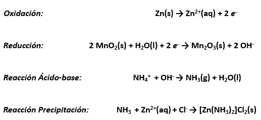 Las reacciones químicas que ocurren en la pila son las siguientes: