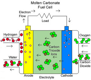 MCFC (DE CARBONATO FUNDIDO)Usa carbonato de sodio o de magnesio fundidos como electrolito. Eficiencia entre 60 y 80 %. Temperatura de operación muy alta, próxima a 650 ºC. Se han construido unidades de 2 Mw de potencia.