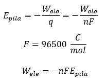 Ahora solo falta recordar que el la energía libre es la energía disponible para hacer trabajo. Por tanto, la variación de la energía libre no es otra cosa que el trabajo máximo que puede realizar un sistema. En este caso ese trabajo es el trabajo eléctrico de la pila. En consecuencia: |
