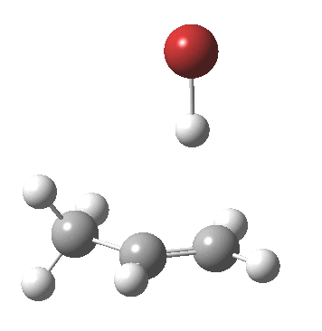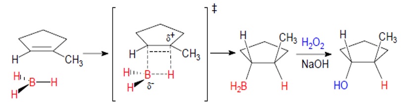 En este caso, si el halógeno queda unido al C menos sustituido se forma el radical intermedio más estable. Esta es la razón de que se cumpla la regioquímica Antimarkovnikov si el mecanismo transcurre a través de radicales.Hay otras adiciones que tienen regioquímica Antimarkovnikov y el mecanismo no transcurre por medio de radicales libres. El caso más importante es la Hidroboración/Oxidación que tiene como resultado la adición de H y OH al doble enlace C=C. En este caso la razón de la regioquímica tiene que ver con que en una primera etapa el boro (electrofílico) del borano se tiene que unir al extremo del doble enlace C=C menos impedido estéricamente (el C menos sustituido). En una segunda etapa el ataque con peróxido de hidrógeno provoca que un grupo OH sustituya al boro. Por tanto, el OH se une al C menos sustituido y el H al C más sustituido.