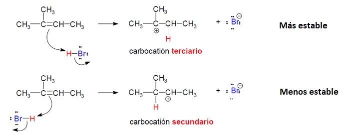 Esta es la regioquímica habitual en las reacciones de adición y está relacionada con la formación intermedia de un intermedio con carga positiva (carbocatión).