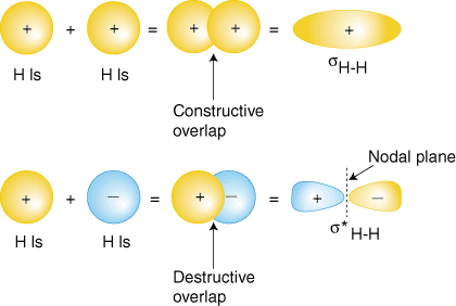 El solapamiento de orbitales atómicos s puede dar lugar a dos tipos de orbitale moleculares σ dependiendo de si la interferencia ha sido constructiva o destructiva. El orbital molecular producido por la interferencia en fase es de baja energía y la mayor densidad electrónica se encuentra entre los átomos (σs) (ORBITAL ENLAZANTE).