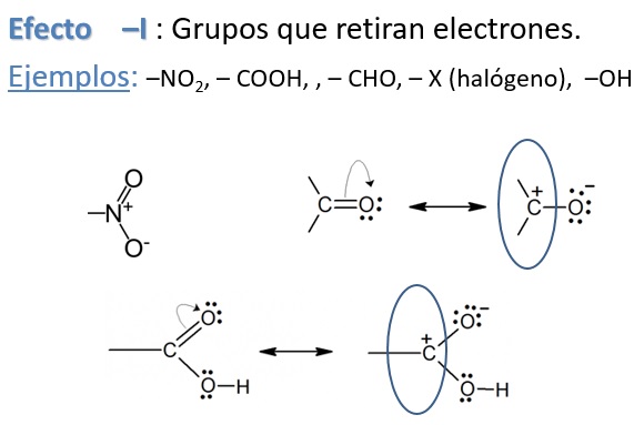 EFECTO INDUCTIVO -ILo producen átomos o grupos atómicos que retiran electrones. En ellos, el átomo que se une a la cadena carbonada sufre algún tipo de deficiencia electrónica que provoca un tirón de los electrones a lo largo de los enlaces sigma que unen los carbonos de la cadena. Por ejemplo, el átomo de nitrógeno del grupo nitro presenta una carga formal positiva, por ello, cuando se une a un radical alquilo, tira de sus electrones. |