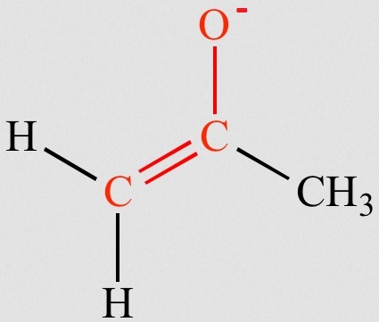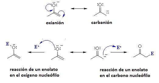 Los enoles son compuestos que tienen un grupo hidroxilo unido a un carbono que participa de un doble enlace. El hecho de que el alqueno esté unido a un sustituyente que dona carga hace que su carácter nucleófilo se vea incrementado, siendo más reactivo que un simple alqueno.Los enolatos son las bases conjugadas de los enolesEl ion enolato se estabiliza por resonancia. Como resultado, la carga negativa se comparte entre el O y el C en posición alfa.