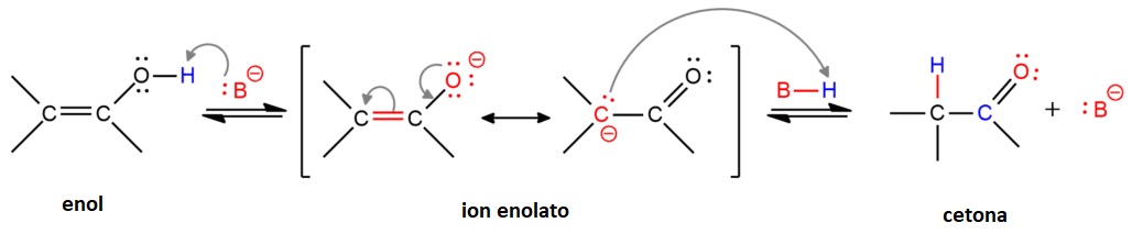 Los enoles son tautómeros de los compuestos carbonílicos. Por ejemplo, la acetona es el tautómero (isómeros estructurales que se diferencian en la posición de un H) del 2 propenol. En general, como los enoles son menos estables, ese equilibrio está desplazado hacia el compuesto carbonílico.La interconversión entre las formas enol y ceto se puede producir en medio ácido o básico.En medio ácido el enol es protonado en el doble enlace. El carbocatión resultante es estabilizado por resonancia con el grupo hidroxilo. La desprotonación final da lugar a la forma ceto.Mirando el proceso en sentido contrario observamos que un compuesto carbonílico en medio ácido tiene tendencia a formar un enol.En medio básico, la base abstrae el protón del grupo hidroxilo del enol. El ion enolato obtenido se estabiliza por resonancia. Por último, la protonación del C en alfa da lugar a la forma ceto.De igual manera podríamos interpretar el proceso en sentido inverso. Una base fuerte puede abstraer un H en alfa de la forma ceto produciendo el ion enolato que, a continuación, es protonado para producir la foma enol. Comprobamos, por tanto, que en presencia de una base fuerte, tanto la forma ceto como la forma enol pueden perder un protón convirtiéndose en el mismo ion enolato.Importante: el compuesto carbonílico puede formar un enol en medio ácido y un ion enolato en medio básicoESTABILIDAD DE LA FORMA ENOLA pesar de que la forma ceto es más estable que la forma enol, en ciertas condiciones el equilibrio se puede desplazar hacia la forma enol. Los dos principales factores que favorecen la forma enol son los siguientes:1.- AromaticidadSi con la forma enólica se alcanza la aromaticidad de la molécula, el equilibrio estará completamente desplazado hacia ella. Es lo que ocurre con el fenol. Su forma ceto no se conoce.2.- Puentes de hidrógenoLos puentes de hidrógeno pueden estabilizar la forma enol. Cuando una base Lewis está presente la forma enólica se estabiliza por la formación de puentes de hidrógeno internos. Esto ocurre, por ejemplo, en las 1,3 dicetonas.Otros tres factores pueden influir en la tautomería cetoenólica3.- DisolventeLos disolventes apolares como el benceno favorecen la forma enol porque los puentes de hidrógeno intramoleculares que la estabilizan no se rompen para establecerse con las moléculas del disolvente. Esto último si puede ocurrir con un disolvente polar prótico como el agua. La 2,4-pentanodiona está en su forma enólica en un 94 % en benceno y, por el contrario, está en su forma ceto en un 81 % en agua.4.- ConjugaciónLa forma enólica puede ser la preferida si la posición del doble enlace del enol facilita la conjugación con otro sistema pi.5.- SustituciónLa estabilidad de los alquenos aumenta con el nivel de sustitución. Este efecto también es aplicable a los enoles.En cuanto a la reactividad de los iones enolato habrá que tener en cuenta que pueden actuar como nucleófilos tanto en el oxígeno como en el carbono.Las reacciones más comunes del ion enolato tienen lugar en el C alfa, sin embargo, hay ocasiones en las que se producen en el oxígeno y este hecho permite "capturar" el enolato.La pérdida del H en alfa será más fácil (mayor acidez) cuanto más estable sea el carbanión que se obtiene (ion enolato). En esta tarea de estabilización juegan un papel fundamental los grupos atractores de carga como nitrilo, carboxilo, sulfónico, ..Los compuestos con dos grupos electrón atrayentes presentan H alfa más ácidos debido a la mayor estabilización del carbanión.