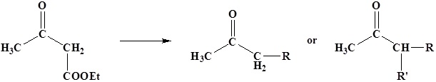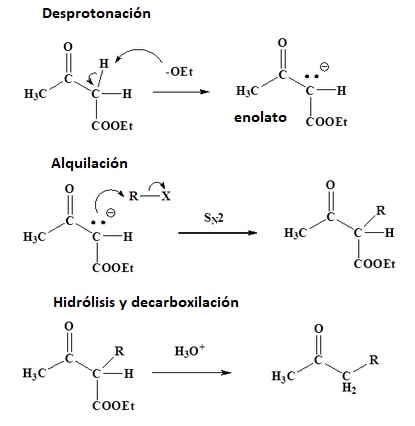 SÍNTESIS DEL ÉSTER ACETOACÉTICOLa síntesis del éster acetoacético permite la conversión de, por ejemplo, el acetoacetato de etilo en una metil cetona con uno o dos grupos alquilo en el carbono alfa.El mecanismo de este proceso es similar al de la síntesis del éster malónico:El proceso de desprotonación y posterior alquilación puede repetirse y conseguir la adición de un segundo grupo alquilo.