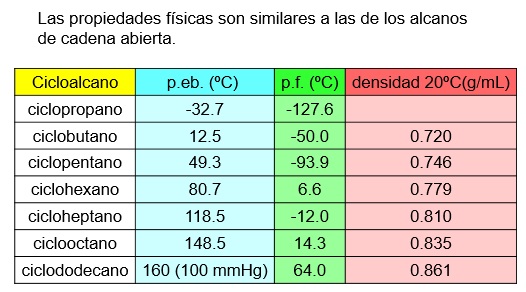 Sus puntos de ebullición, de fusión y densidades son algo mayores que los de sus correspondientes alcanos lineales.