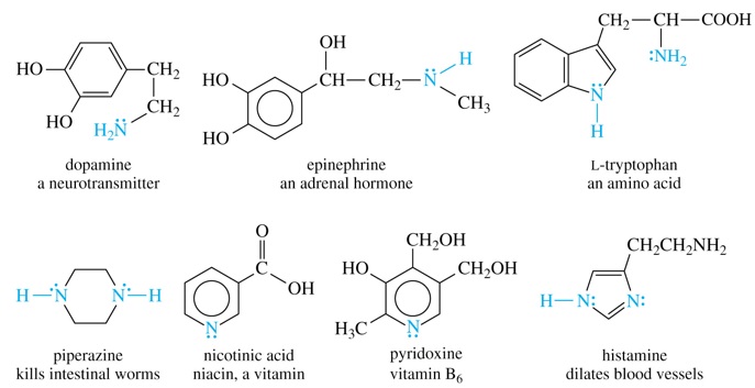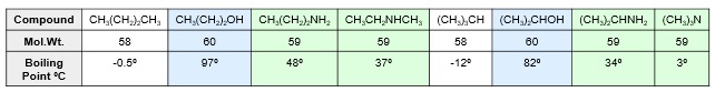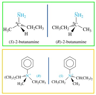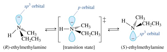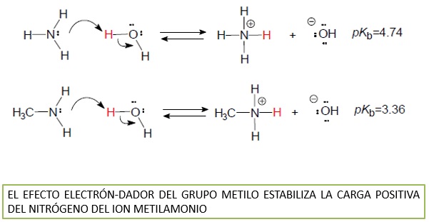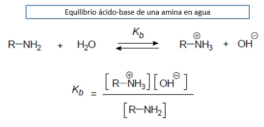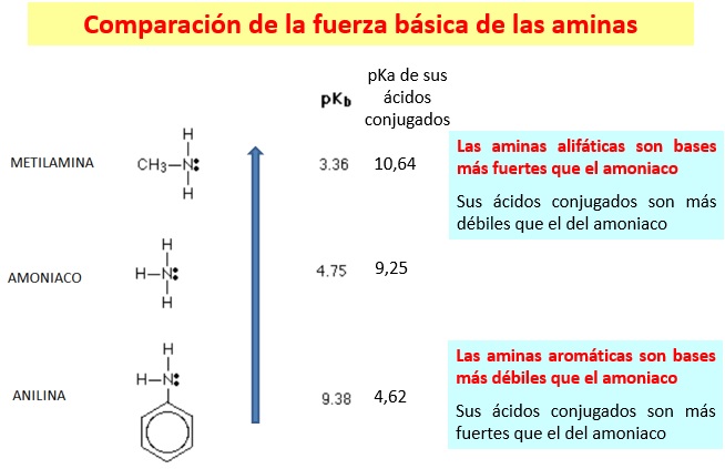 Las aminas pueden considerarse como derivados del amoniaco. Pueden ser primarias, secundarias o terciarias dependiendo del núero de cadenas carbonadas unidas al nitrógeno.Hay compuestos con más de un grupo amino, por ejemplo el diamino metano: H2N-CH2-NH2. También hay aminas cíclicas en las que el nitrógeno está incluido en un anillo, convirtiéndose en una amina secundaria o terciaria, por ejemplo:De manera natural las aminas están presentes en proteínas, vitaminas, hormonas, ...Hoy día las aminas tienen grandes aplicaciones. Purificación de agua, manufactura de medicinas, insecticidas y pesticidas. Producción de aminoácidos y vitaminas.ESTRUCTURAEl átomo de nitrógeno de las aminas tiene hibridación sp3La molécula de amina son piramidales, con un par de electrones ocupando un orbital híbrido sp3 no enlazado.Esta estructura permite que, si los tres sustituyentes son distintos, la molécula de amina podría presentar quiralidad. Sin embargo, la interconversión entre configuraciones R y S es tan rápida a temperatura ambiente que no se han podido separar.Las aminas pueden ser quiralesPROPIEDADES FÍSICASLas aminas son polares y pueden formar puentes de hidrógeno. Esto provoca que se an sustancias con altos puntos de fusión y ebullición y que, además, tengan buena solubilidad en agua.La siguiente tabla muestra que los puentes de hidrógeno en los alcoholes son más fuertes que en las aminas. Por ello, los puntos de ebullición de los alcoholes son mayores que los de las aminas de similar masa molecular.Por otra parte, al pasar de aminas primarias a secundarias y terciarias hay una disminución en los puntos de ebullición debido a que se pueden formar menor número de puentes de hidrógeno.La solubilidad en agua de las aminas es similar a la de los alcoholes de un número comparable de carbonos. La solubilidad de las aminas terciarias es similar a las de los éteres. Además, hay que considerar que la basicidad de las aminas permite que sean disueltas en ácidos minerales diluidos.Las aminas presentan un comportamiento moderadamente básico.Las aminas alifáticas son más básicas que las aminas aromáticasEn el caso de las aminas alifáticas el ion amonio se estabiliza por la cesión de carga de las cadenas carbonadas unidas al NEn el caso de las aminas aromáticas, la disminución de la basicidad se debe a que el par de electrones del N no está tan disponible como en las aminas alifáticas porque se comparten con el anillo por efecto resonante.