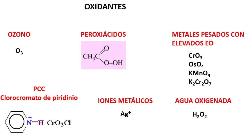 Un reductor es una especie química que reduce a otra mientras ella se oxida. Entre los reductores habituales en Química Orgánica encontramos los siguientes:Los metales activos, electropositivos, son por naturaleza agentes reductores ya que tienen elevados potenciales normales de reducción. Por ejemplo, el sodio se utiliza disuelto en amoniaco.El hidrógeno H2 se utiliza junto con catalizadores basados en metales (Pd, Pt, ..)Los hidruros son ampliamente utilizados en procesos de reducción, en particular los hidruros complejos como el DIBAL (hidruro de diisobutilaluminio).Entre ellos están el borohidruro de sodio y el hidruro doble de litio y aluminio. El primero reduce aldehidos y cetonas a alcoholes, el segundo, más activo, es capaz de reducir ácidos carboxílicos y derivados.Otros reductor ampliamente utilizado es la hidracina.NH2NH2Un oxidante es una especie química que oxida a otra mientras ella se reduce. Entre los oxidantes habituales en Química Orgánica encontramos los siguientes:Los elementos no metálicos con elevada electronegatividad son por naturaleza agentes oxidantes:Los halógenos ganan con facilidad electrones disminuyendo nu número de oxidación. De manera similar, las especies químicas ricas en oxígeno, son oxidantes típicos en Química Orgánica. Entre ellas tenemos ozono, peróxido de hidrógeno o peroxiácidos.Otra fuente de especies oxidantes contienen no metales o metales en elevados estados de oxidación.El permanganato de potasio y el dicromato de sodio son ampliamente utilizados en procesos de oxidación. Además el clorocromato de piridinio (PCC) es un oxidante específico que oxida los alcoholes primarios a aldehidos.Por otra parte, los iones de metales como la plata son oxidantes. En el proceso de oxidación se reducen y dan lugar al metal (reacción del espejo de plata, útil en el reconocimiento de aldehidos). |