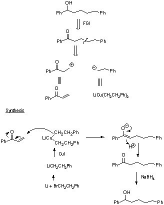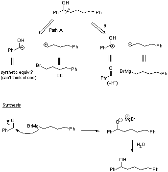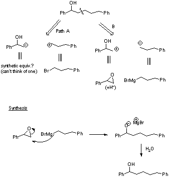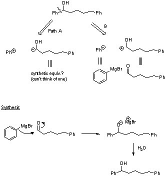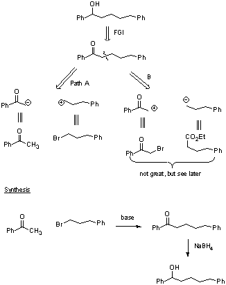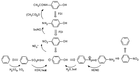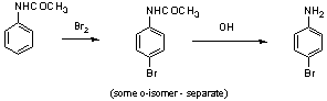 EJEMPLO: SÍNTESIS DE DERIVADOS DEL BENCENO1.- ¿Cómo sintetizar la p-bromoanilina a partir del benceno?La mejor elección es bromar la anilina, pero tenemos el problema de bromar también la posición orto.El problema se resuelve si protegemos el grupo amino y lo convertimos en el N-acetil derivado de la amina. La desprotección es sencilla.El proceso global quedaría:2.- Otra síntesis en la que participa el Bromo3.- Otra retrosíntesis de un derivado del fenol |