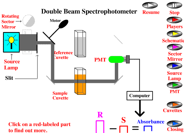 ¿CÓMO FUNCIONA UN ESPECTROFOTÓMETRO UV?Para entender el funcionamiento de un espectrofotómetro UV puede emplear esta animación:Haciendo click sobre la imagen se inicia la animación. Úsela para identificar en el aparato los siguientes dispositivos:1.- Fuente estable de energía radiante (lámpara de deuterio o de arco de xenón)2.- Recipiente transparente para la muestra (de cuarzo o plástico en el visible)3.- Dispositivo que aisle la región de interés en el espectro (monocromador de prisma o red)4.- Detector de radiación que la convierta en señal eléctrica (fotomultiplicador)5.- Sistema de tratamiento o lectura de la señal |