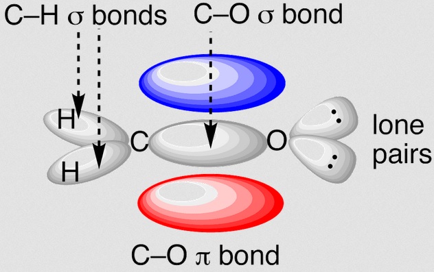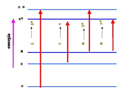 a) Moléculas como el metano que sólo tienen electrones σLa energía necesaria para que se dé el tránsito desde el orbital enlazante σ al antienlazante σ * es muy grande, se necesita por tanto radiación de alta energía (frecuencia) o lo que es lo mismo baja longitud de onda. En el caso del metano el máximo de absorción de produce a 125 nm. Esa es la zona del ultravioleta de vacío (<185 nm) demasiado lejana y poco útil. El etano que se encuentra en una situación similar absorbe también en la misma zona del espectro (135 nm) |