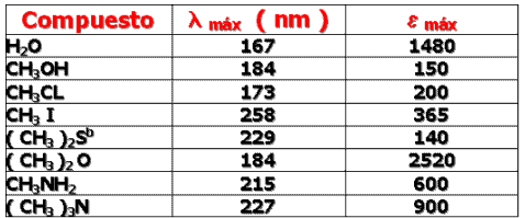 b) Moléculas como el agua con electrones σ y electrones no compartidosLa transición electrónica que se produce es n → σ * . Esta situación es típica de compuestos orgánicos saturados con electrones no enlazados (procedentes de heteroátomos). En este caso el salto energético es menor que antes y suele producirse entre 150 y 250 nm, siendo lo habitual por debajo de 200 nm. |